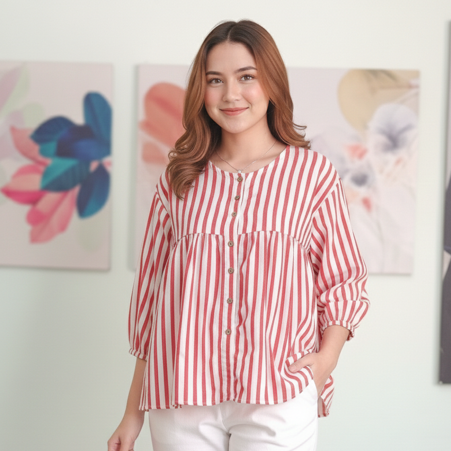 Elevate your casual wardrobe with this charming and airy striped blouse. Designed for comfort without sacrificing style, this piece features a relaxed, flowy silhouette and delicate pleated detailing that adds a touch of feminine flair to any outfit. Pair this blouse with crisp white trousers and your favorite sneakers for a fresh, daytime look, or tuck it into high-waisted denim for a more structured ensemble.