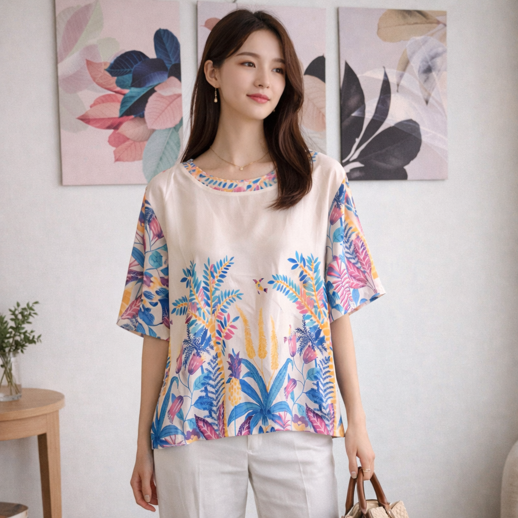 Bring a burst of fresh elegance to your wardrobe with this Tropical Garden satin top. Set on a soft ivory base, the design features vibrant botanical prints in shades of blue, pink, yellow, and teal, creating a lively yet sophisticated look. The smooth satin fabric offers a graceful drape, making it both comfortable and effortlessly stylish. Designed for versatility, this top transitions seamlessly from day to evening—perfect for work, casual outings, or relaxed gatherings.