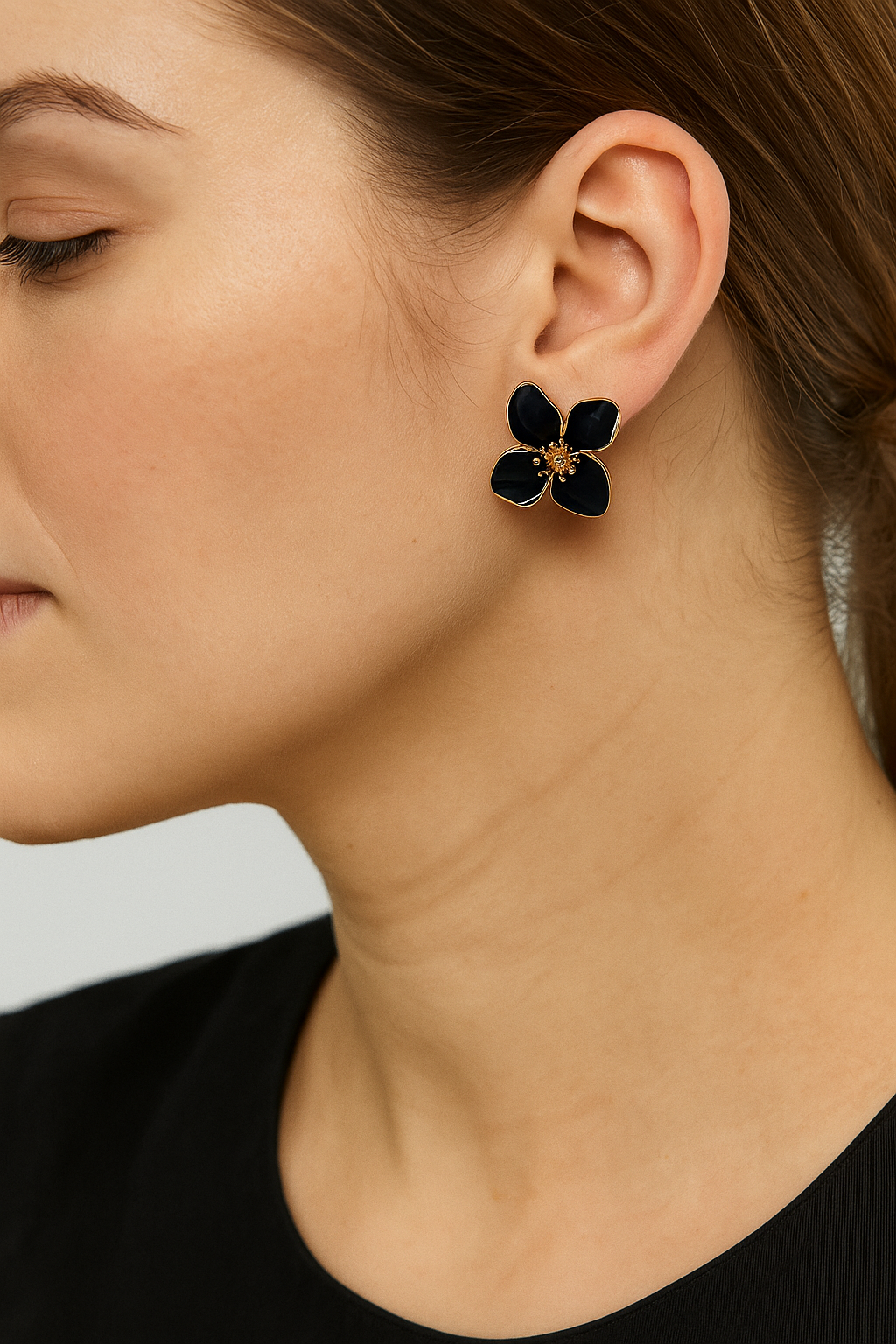 Introducing our exquisite black and gold flower earrings, a perfect blend of elegance and sophistication. Crafted with meticulous attention to detail, these earrings are designed to add a touch of glamour to any outfit.