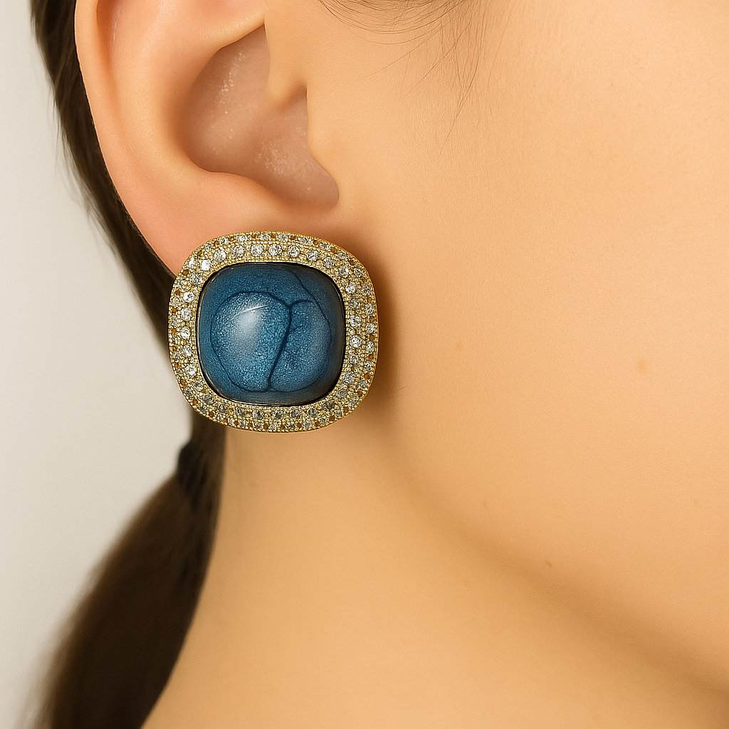 Introducing our exquisite pair of stud earrings, featuring two stunning blue stones adorned with elegant gold accents. These earrings are the perfect accessory to add a touch of sophistication and style to any outfit.