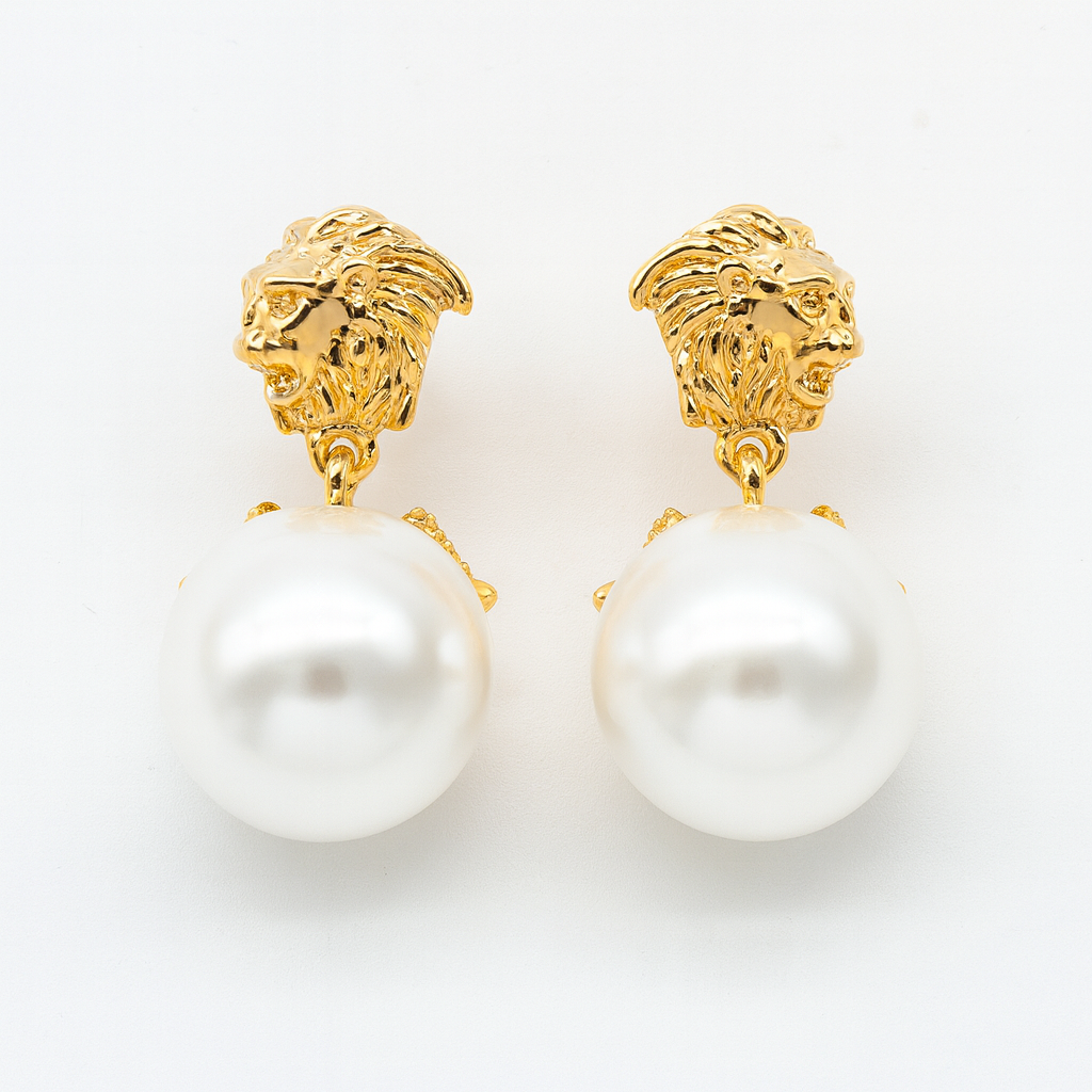 Add a touch of regal elegance to your look with these stunning gold-tone drop earrings. Each earring features an intricately detailed lion head stud, symbolizing strength and sophistication. Suspended below is a large, lustrous faux pearl with a smooth, high-gloss finish that catches the light beautifully.