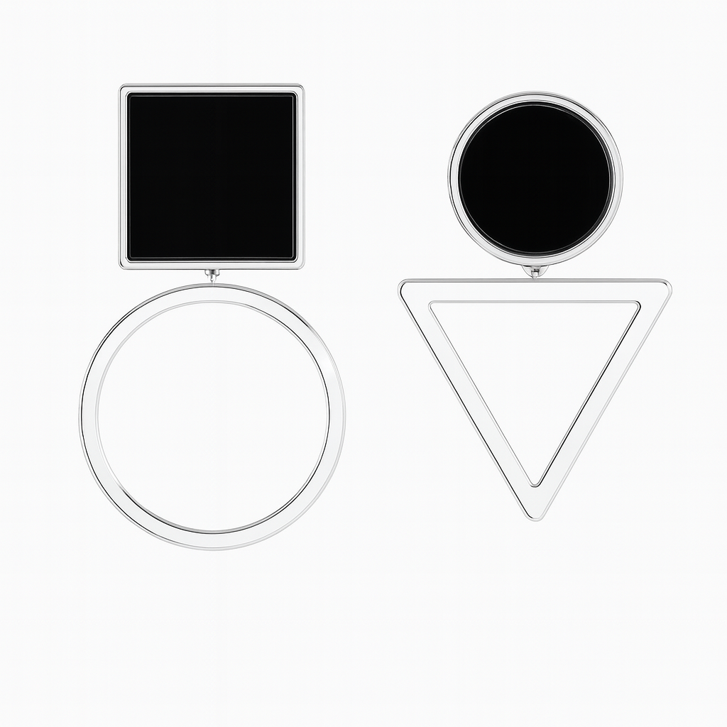 Make a bold, contemporary statement with these uniquely designed asymmetrical geometric drop earrings. This striking pair combines minimalist design with architectural shapes, featuring a contrast of glossy black and polished silver tones. One earring showcases a classic black square stud paired with a large, open silver circle drop, while the other features a black circular stud with a modern, open silver triangle drop. these earrings are perfect for adding an avant-garde edge to any outfit, from office wear to evening events.