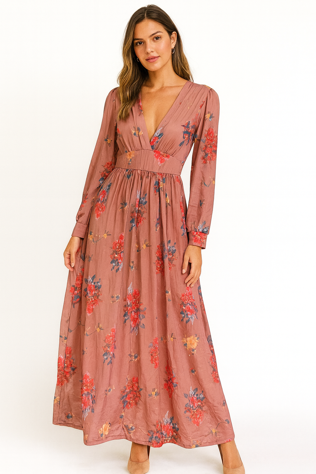 Step out in timeless romance with the Elegance Blooms Maxi Dress. This stunning piece features a universally flattering, deep V-neckline and elegant long sleeves, making it perfect for year-round wear. The dress is adorned with a lush vintage-inspired floral print in rich tones of deep rose, vibrant crimson, and subtle slate blue a perfect blend of romance and sophistication.