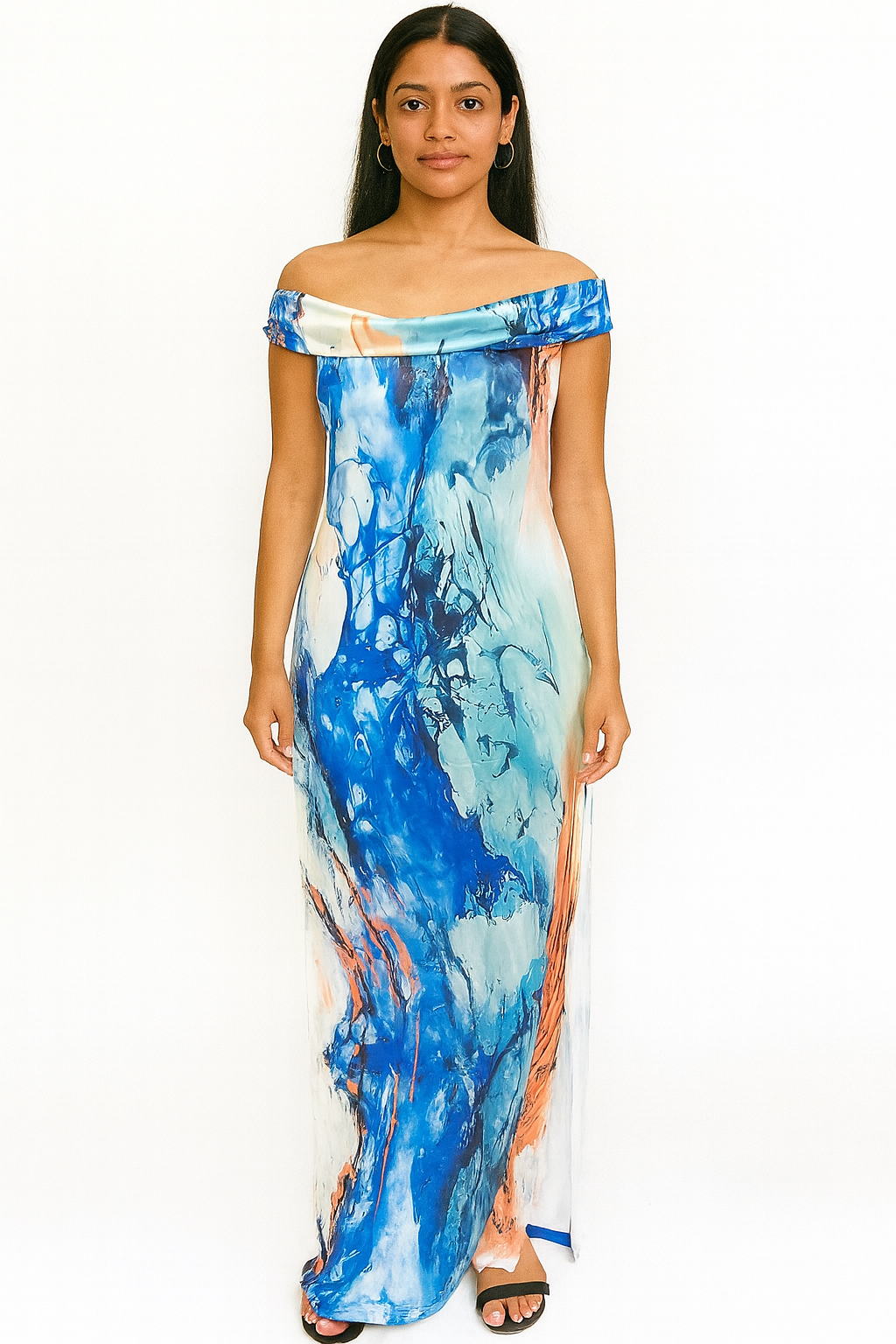 This elegant orange blue one piece dress, crafted from high-quality cloth, exudes sophistication and charm. Its rich hue and soft texture make it a perfect addition to any wardrobe, ideal for both casual outings and formal events. The dress's graceful drape enhances its appeal, inviting admiration and making a statement wherever it is worn.