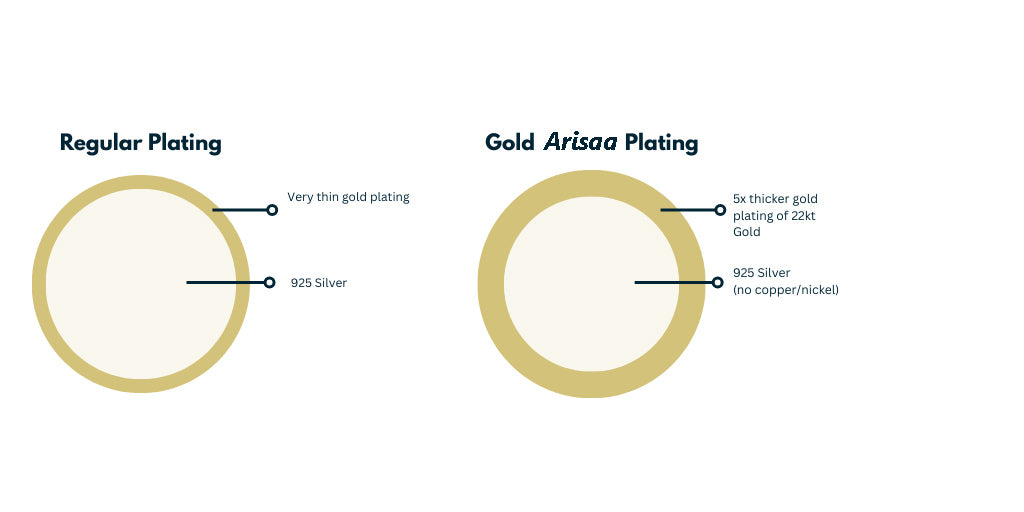Arisaa is a pioneer in the international technique of Gold Vermeil-5 times thicker plating of 22kt Gold compared to regular gold-plated jewellery, done onpure 925 silver. No copper, brass, or nickel, justskin-friendly, long-lasting jewellery that’s designed to last a lifetime.