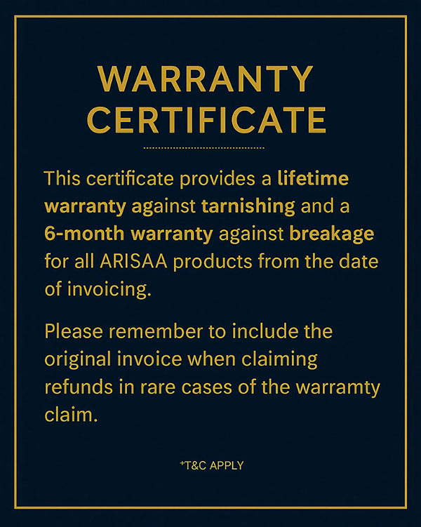 At arisaa, we’ve done our best to create jewellery that’s low-maintenance, durable, and made to last. While it’s perfectly safe for everyday use — including occasional exposure to water and sweat — we recommend keeping it away from harsh chemicals like perfumes and detergents. For maximum longevity, let your jewellery be the last thing you put on and the first thing you take off.