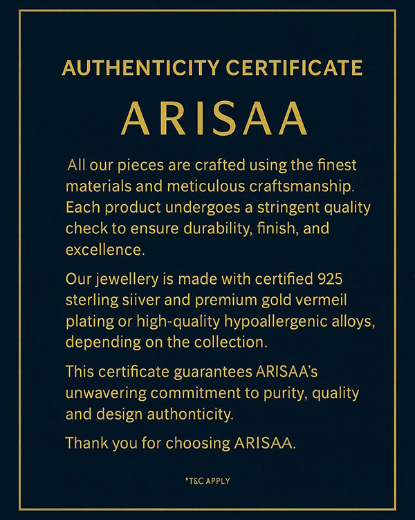Arisaa is a pioneer in the international technique of Gold Vermeil-5 times thicker plating of 22kt Gold compared to regular gold-plated jewellery, done onpure 925 silver. No copper, brass, or nickel, justskin-friendly, long-lasting jewellery that’s designed to last a lifetime.