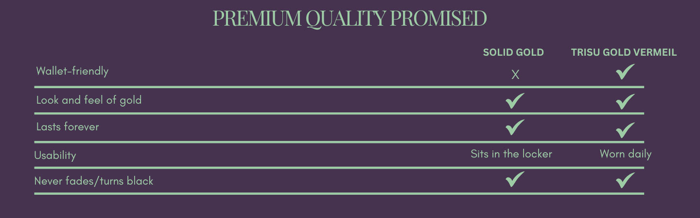 The unique Gold Vermeil plating makes our jewellery last a minimum of 2 years and even up to a lifetime.