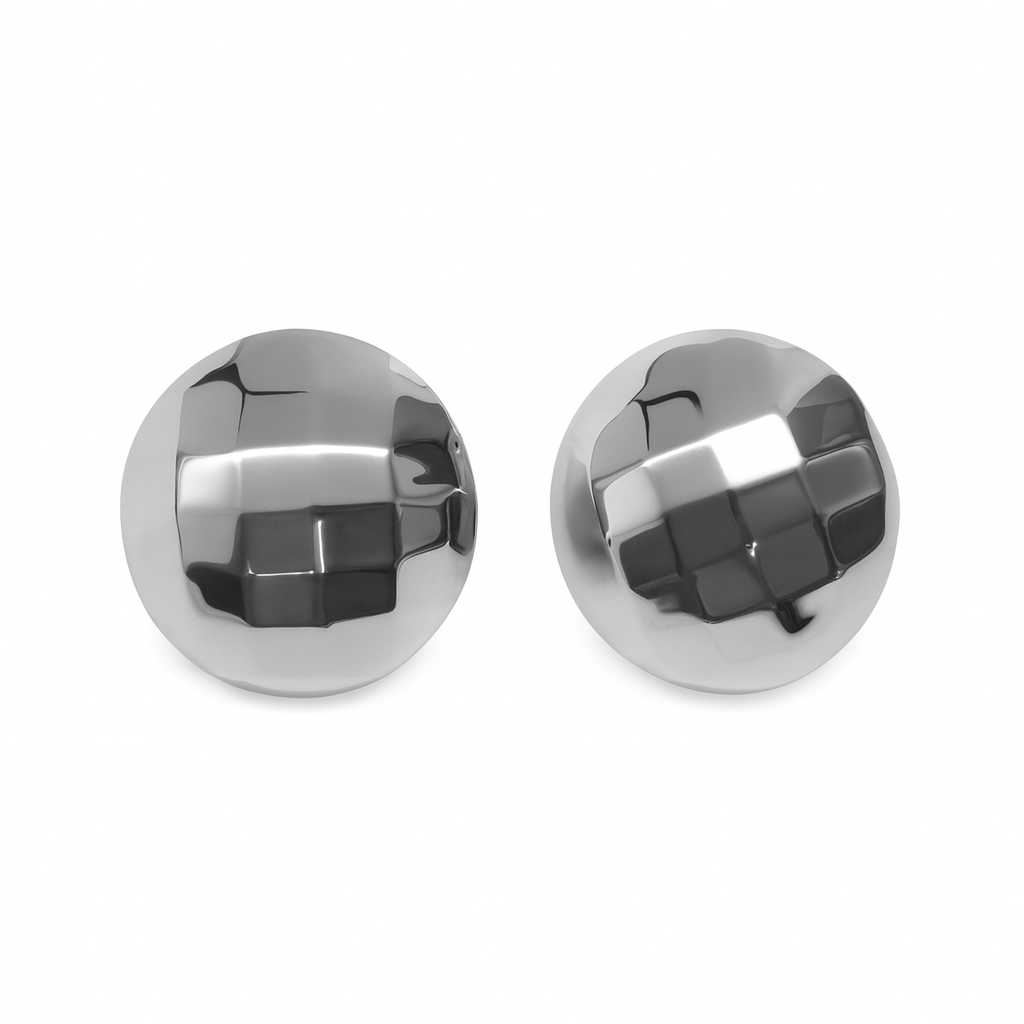 Enhance your look with these elegant silver metal ball earrings, perfect for adding a touch of sophistication to any outfit. The minimalist design of the two silver balls on a white surface exudes a modern and chic vibe