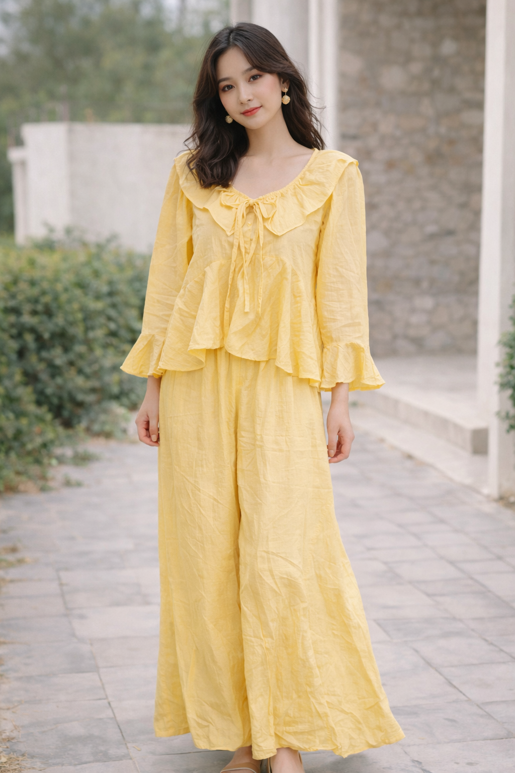 Effortlessly chic and beautifully breezy, this co-ord set is crafted from lightweight crinkle cotton for all-day comfort. The ruffled V-neck top features a soft tie-up detail and flared sleeves, adding a romantic touch, while the matching flowy skirt with an elasticated waistband offers ease and movement. Perfect worn together or styled separately, this set is a versatile must-have for relaxed days and casual outings.