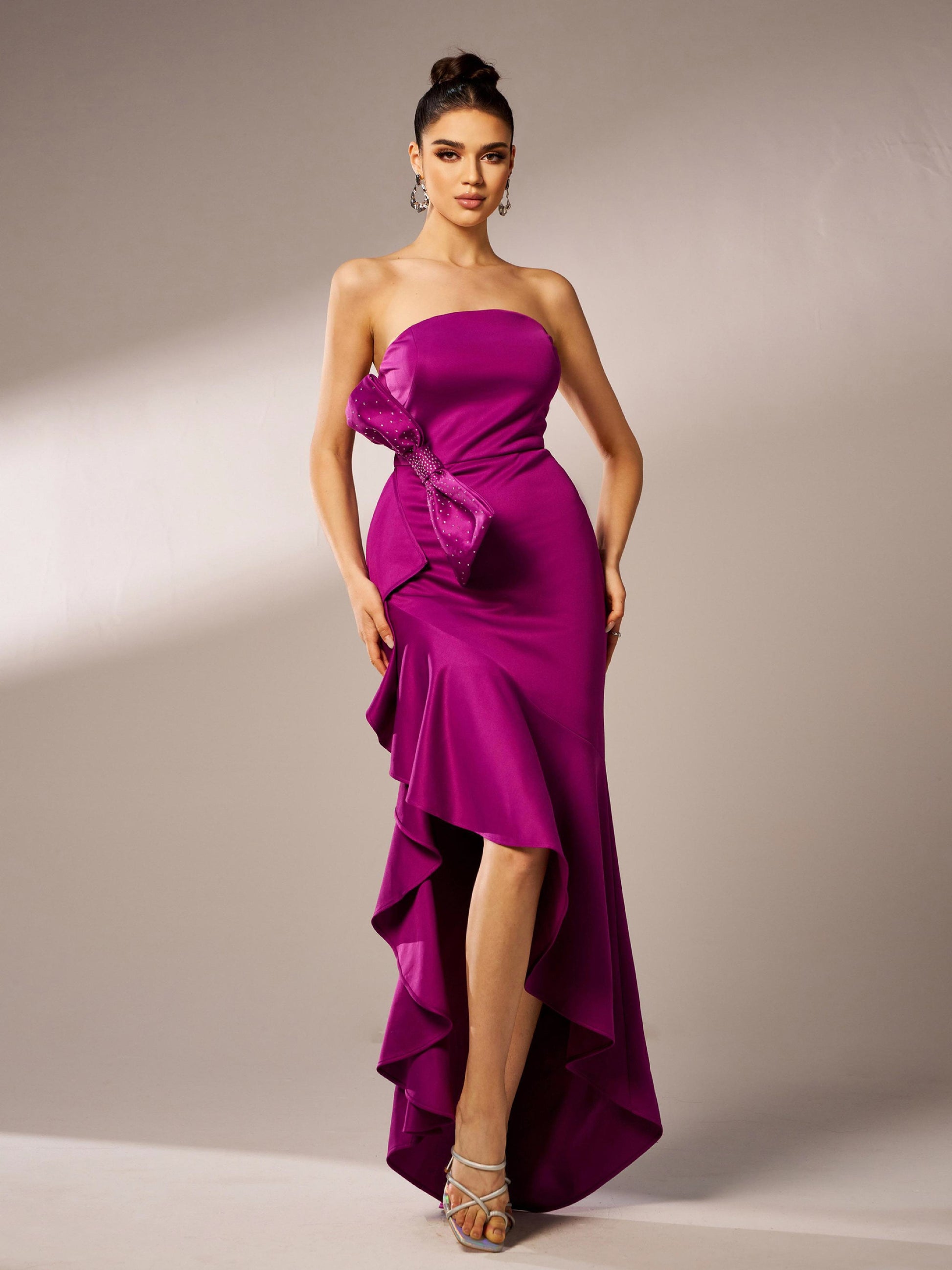Make an unforgettable entrance in this exquisite, strapless high-low gown in a captivating, rich fuchsia/magenta hue. Designed for the woman who loves glamour and sophistication, this dress is the epitome of modern evening wear. Pair this gown with minimalist diamond jewelry and metallic strappy heels to let the dress's vibrant color and sculptural design take center stage. Turn heads and feel like royalty. Add the Regal Ruffle Gown to your wardrobe today!